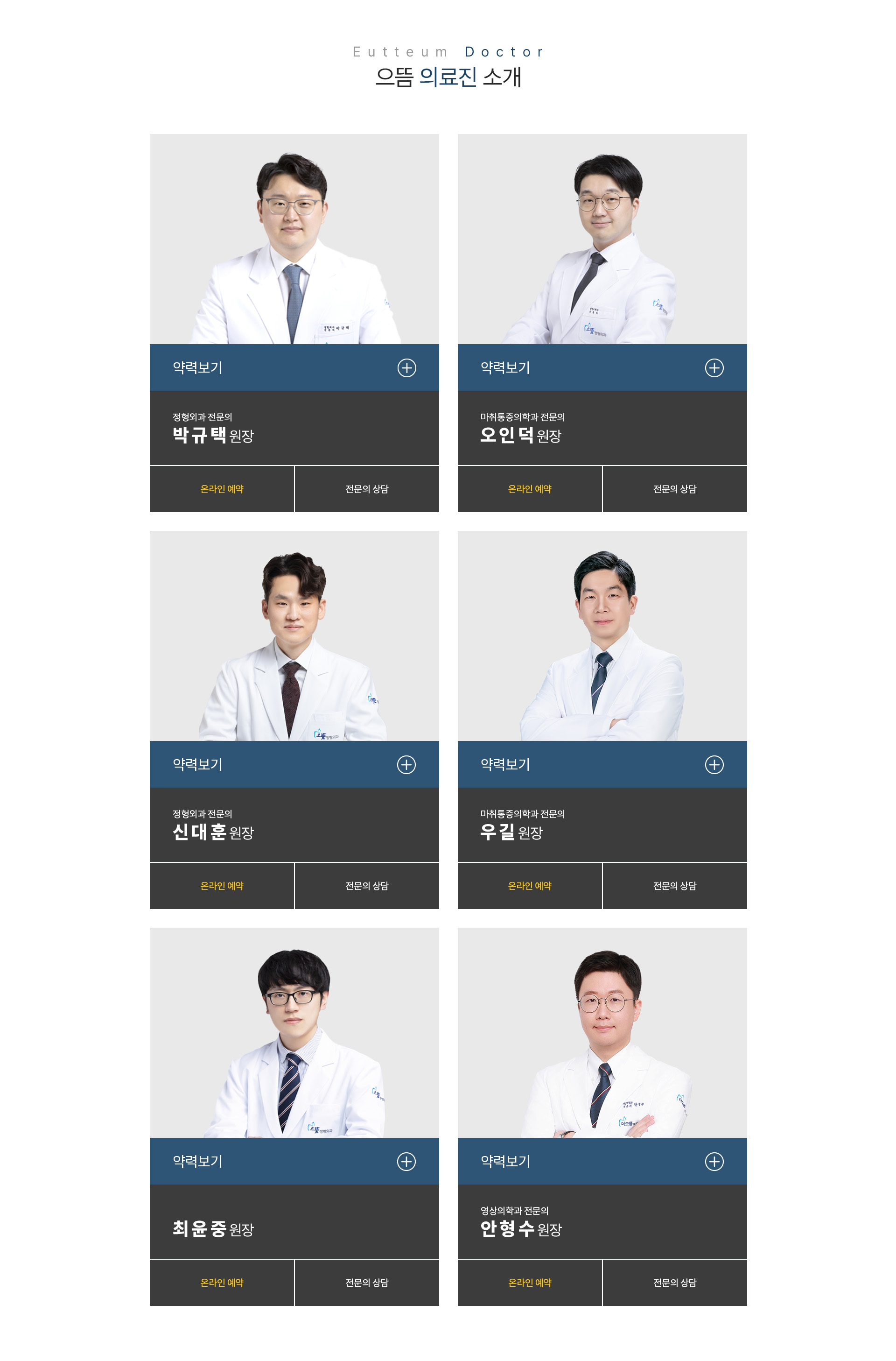 박규택 대표원장 약력보기 오인덕 원장 약력보기 신대훈 원장 약력보기 우길 원장 약력보기 최윤중 원장 약력보기 정재우 원장 약력보기 안형수 원장 약력보기 박규택 원장 진료예약 바로가기 오인덕 원장 진료예약 바로가기 신대훈 원장 진료예약 바로가기 우길 원장 진료예약 바로가기 최윤중 원장 진료예약 바로가기 정재우 원장 진료예약 바로가기 안형수 원장 진료예약 바로가기 박규택 원장 1:1 문의 오인덕 원장 1:1 문의 신대훈 원장 1:1 문의 우길 원장 1:1 문의 최윤중 원장 1:1 문의 정재우 원장 1:1 문의 안형수 원장 1:1 문의